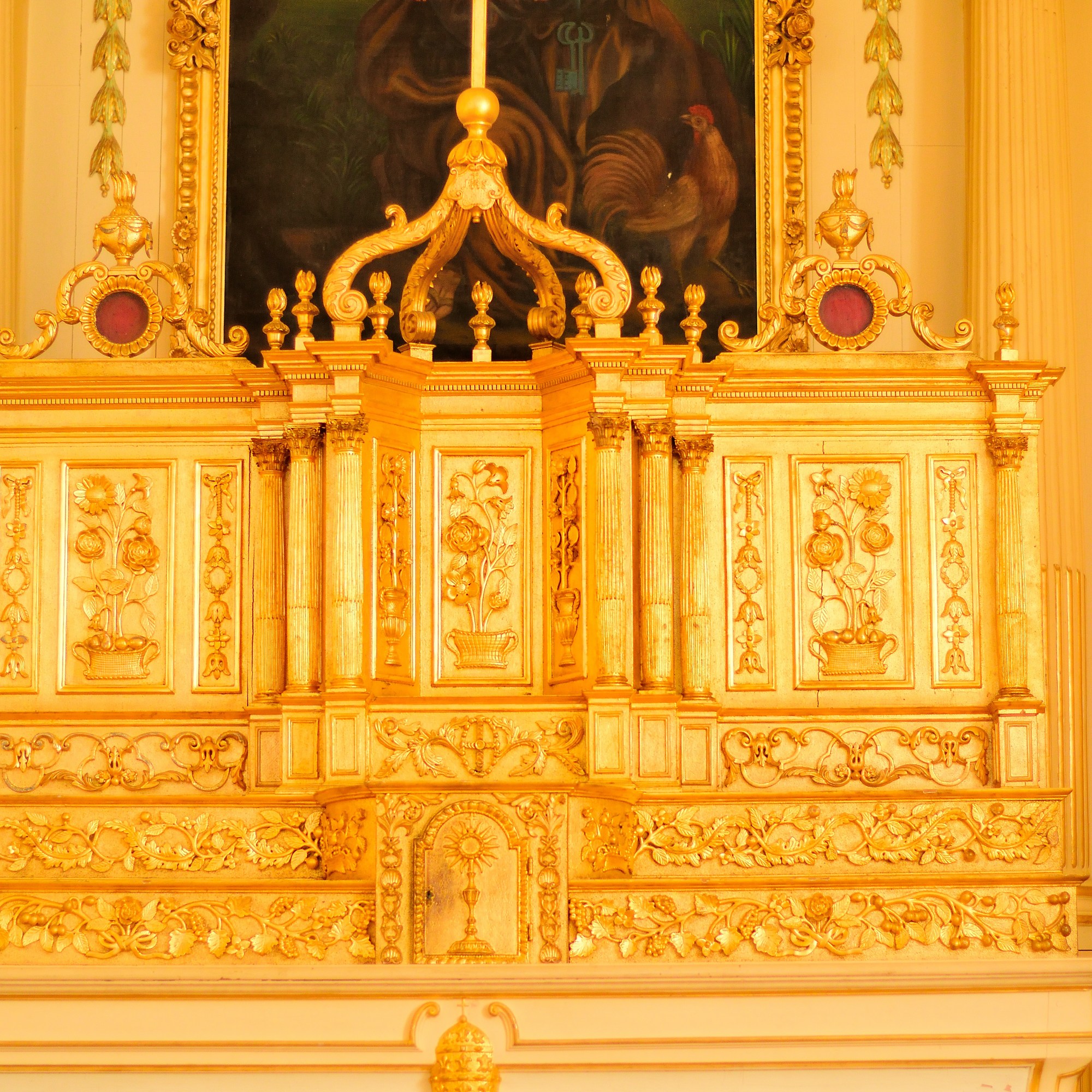 À gauche : vue depuis les hauteurs de Saint-Pierre-d’Orléans en regardant vers l’Ange-Gardien. Au centre : le toit rouge de l’église Sainte-Famille-d’Orléans. À droite : détails de la monstrance et du baldaquin dans l’ancienne église de Saint-Pierre-d’Orléans. (2021 ©Joseph-N-M Langlois)